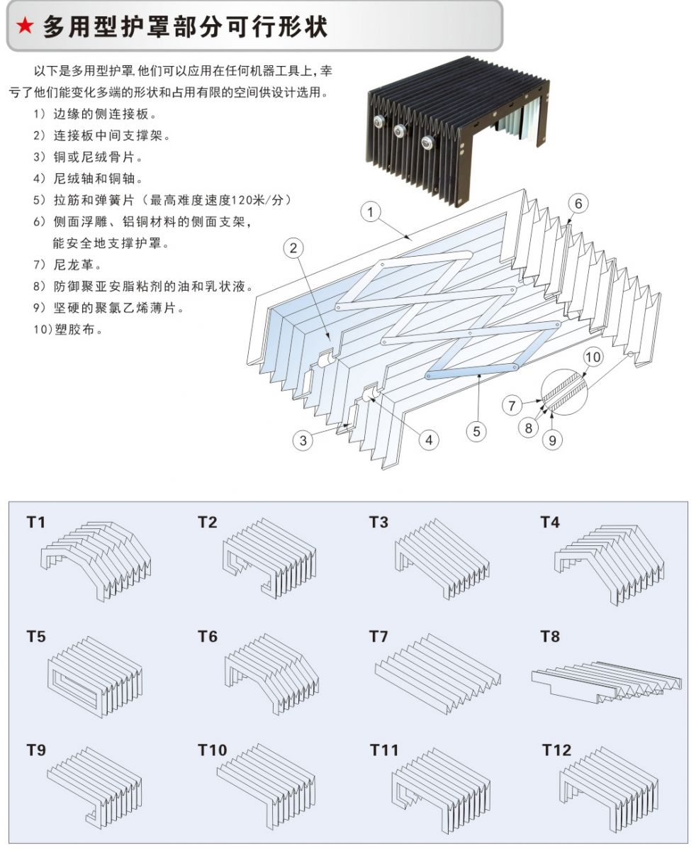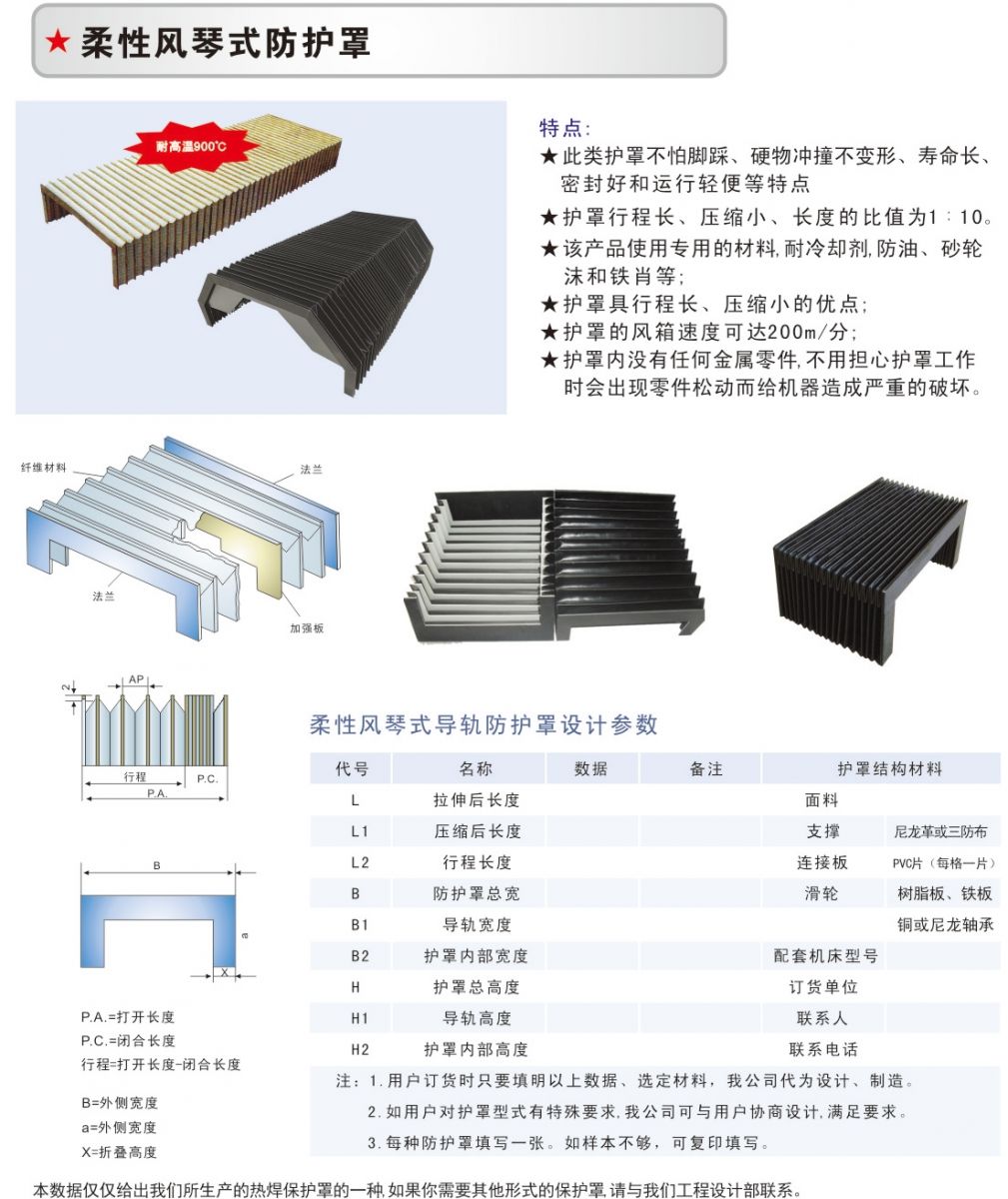 本產(chǎn)品的特點(diǎn)是:防油,防水,防火,耐高溫,阻燃,耐強(qiáng)壓,防冷卻劑等.此折疊護(hù)罩是最先進(jìn)的一種形式,它能彌補(bǔ)其它護(hù)罩解決不了的問(wèn)題。這類護(hù)罩在世界占有領(lǐng)先地位。也可按用戶需要安置高速?gòu)椈?我公司風(fēng)琴防護(hù)罩的形式多種多樣,如用戶對(duì)護(hù)罩有特殊要求我廠可根據(jù)客戶要求制造.