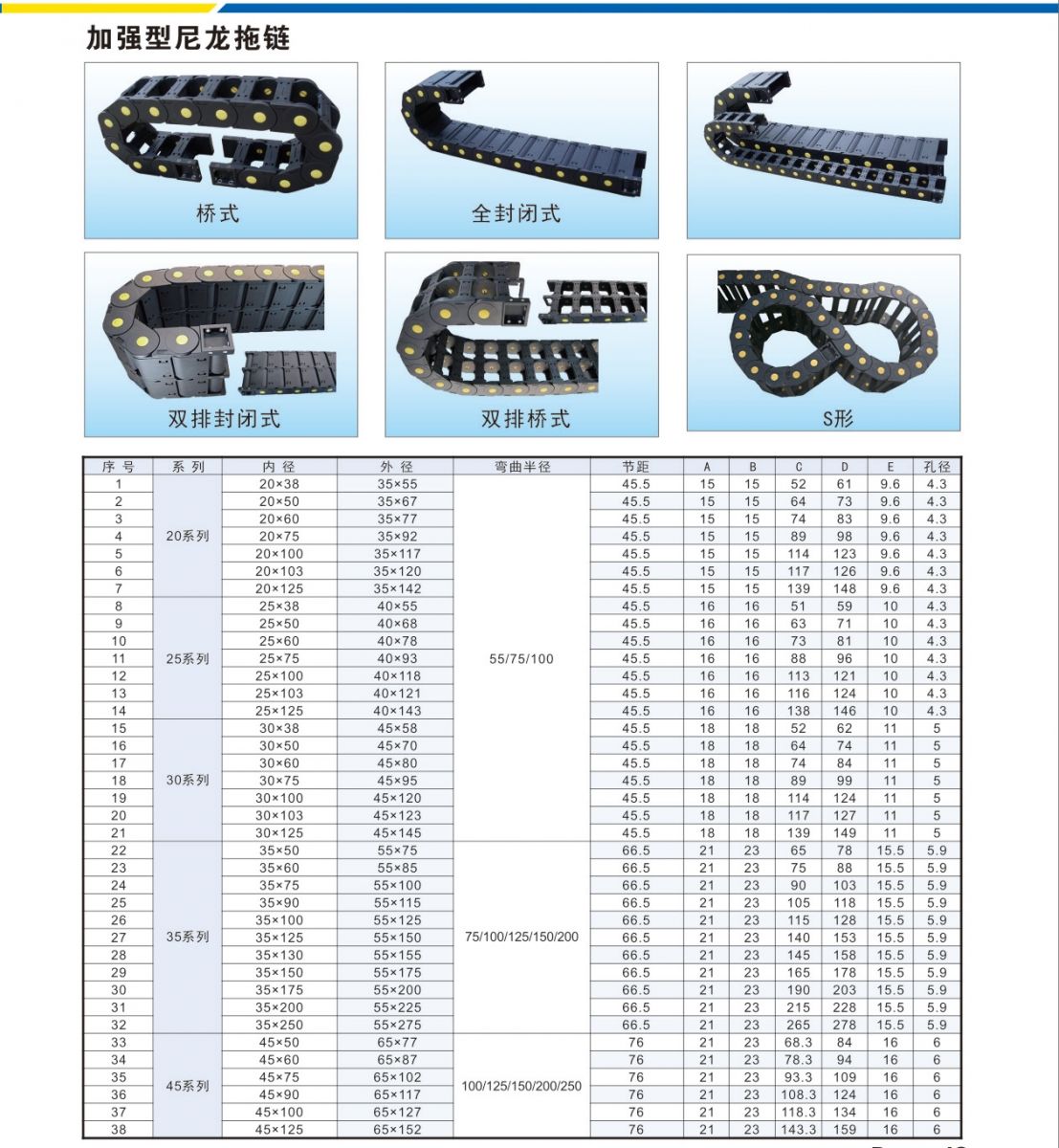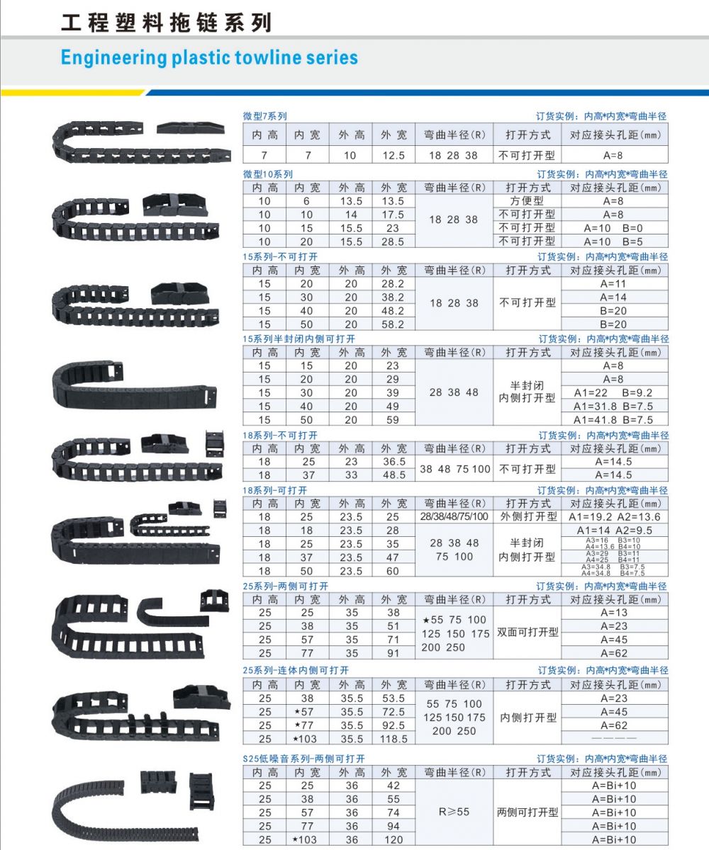 我公司大量生產(chǎn)供應(yīng)塑料電纜拖鏈,該產(chǎn)品備三種結(jié)構(gòu)型式:(1)全封閉式(2)半封閉式(3)橋式。該產(chǎn)品由一節(jié)節(jié)鏈板組成,彎曲半徑大小互換,用戶可自行調(diào)整長度,裝卸簡單。耐磨、耐沖擊、強(qiáng)度高、重量輕、適合快速移動。結(jié)構(gòu)堅固,不會變形!我公司現(xiàn)有模具規(guī)格齊全,能夠滿足國內(nèi)機(jī)械行業(yè)的要求!歡迎廣大用戶來電洽談,定貨!電話:0317-6287811